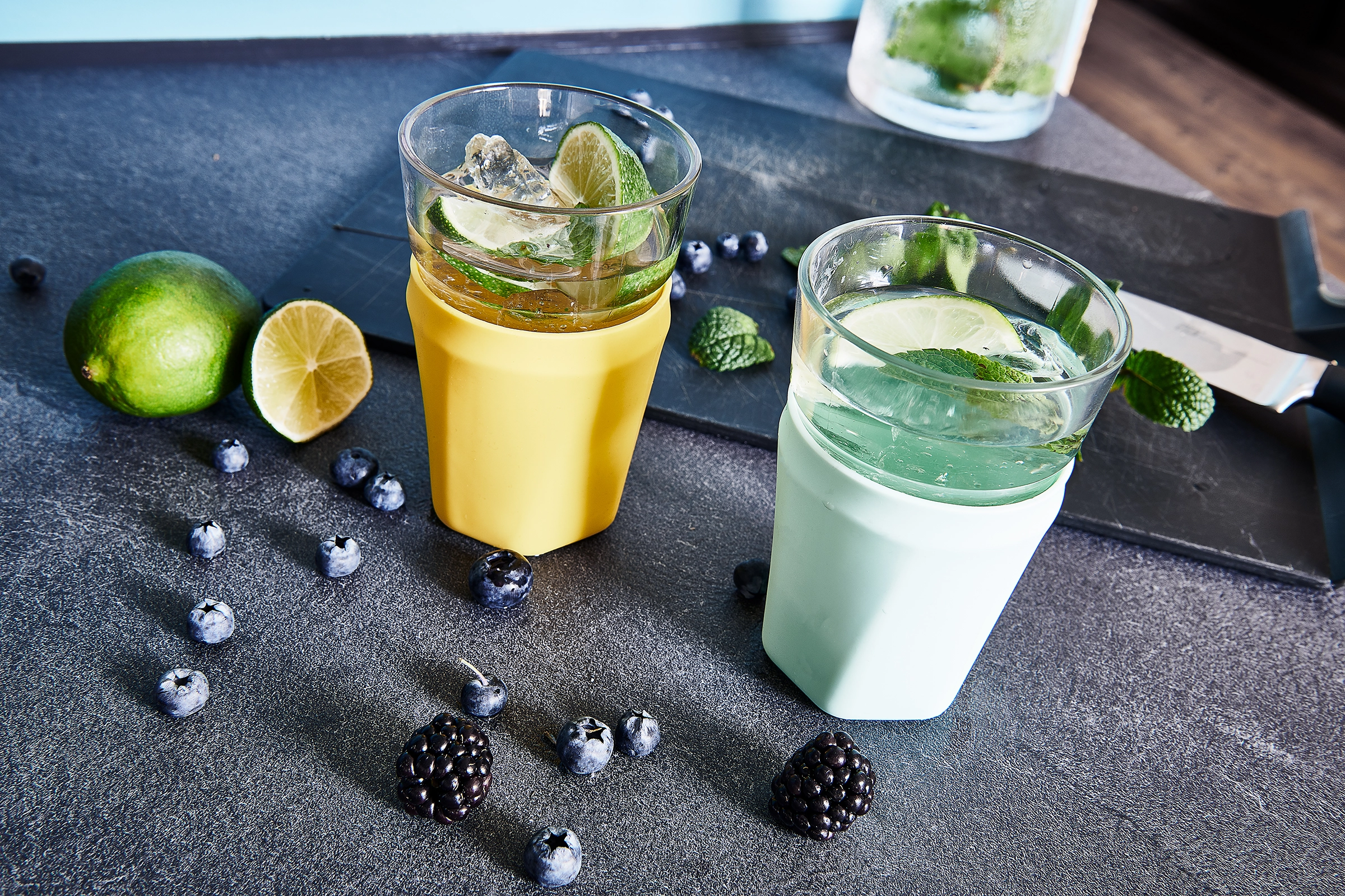 The Cup sleeve is available in four stylish colours: grey, yellow, pink, and a mint version that also glows in the dark.