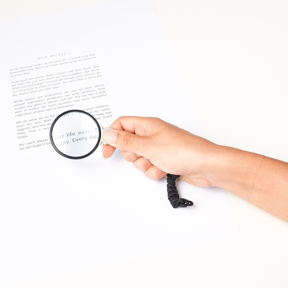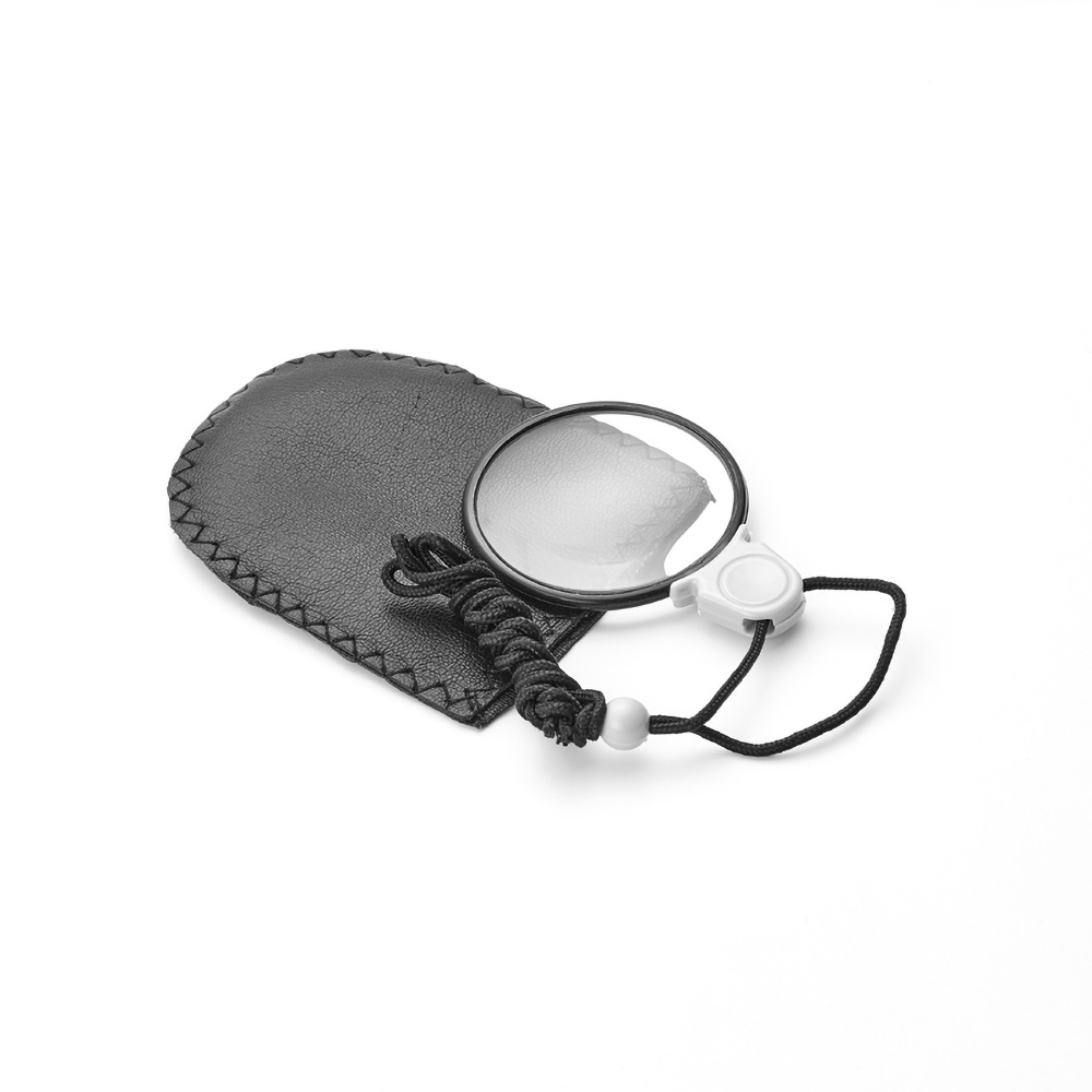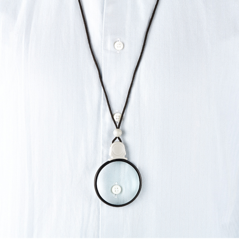 A round shaped magnifier for reading small prints. With the cord the magnifier can be carried around the neck easily. This way you always have the magnifier at hand.