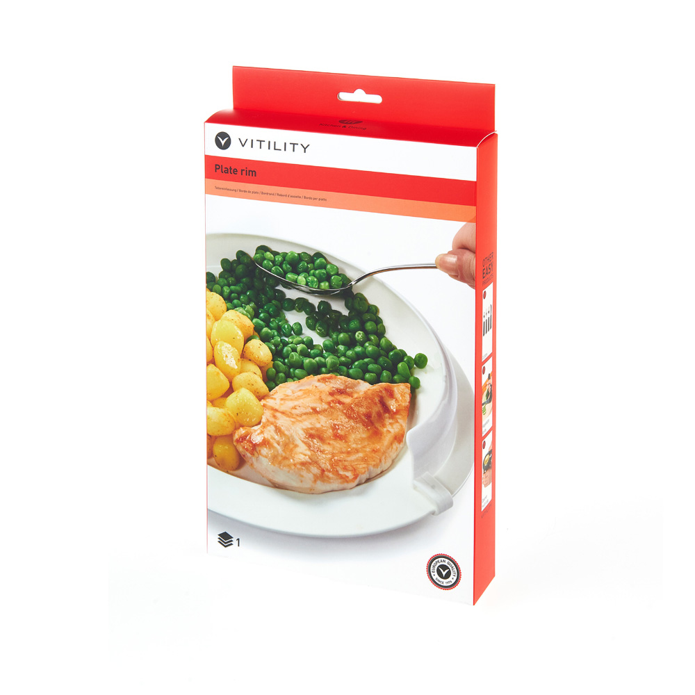 The plate rim can be attached around a normal plate. This creates a vertical rim, allowing food to be pushed onto cutlery more easily and reducing spillages. It is also possible to eat using only one hand with the plate rim.