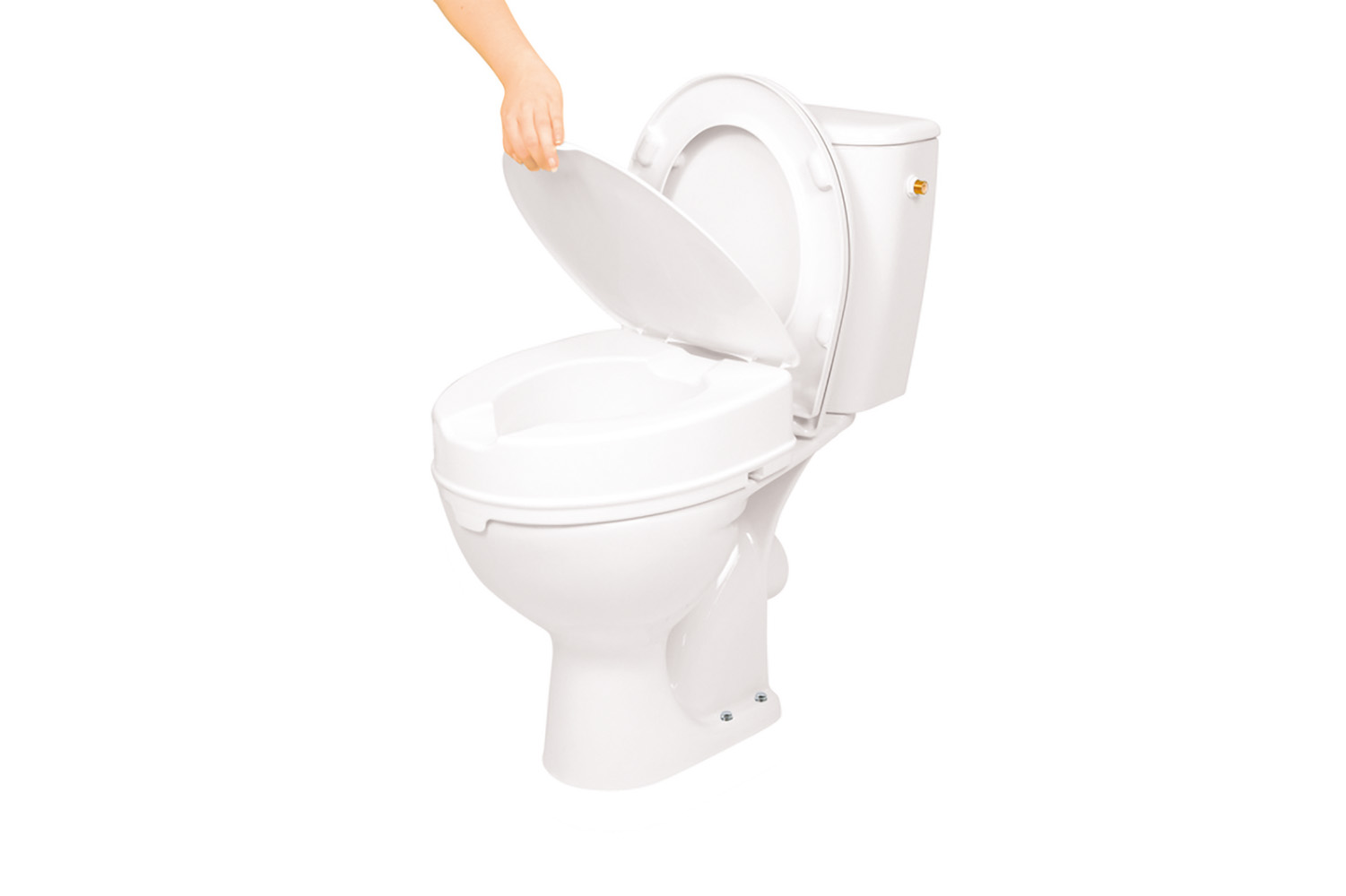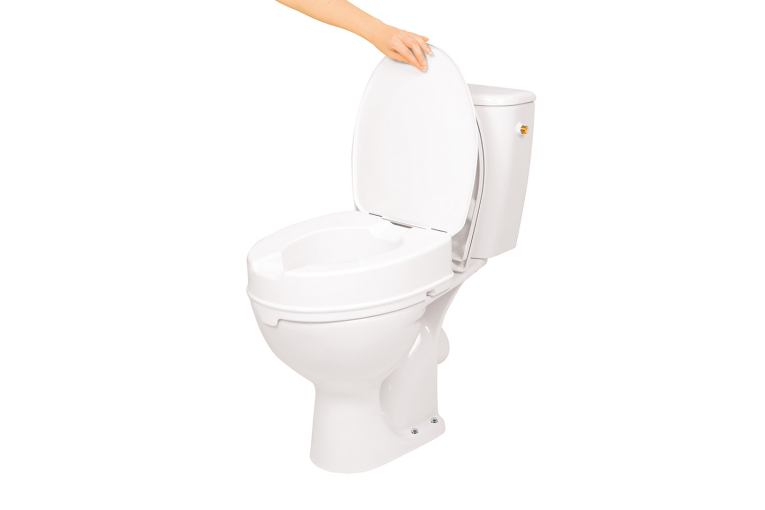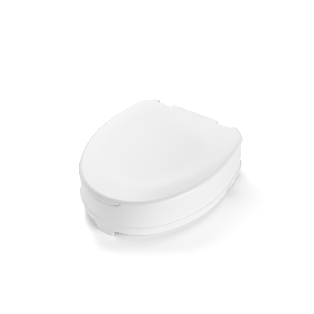 The toilet seat raiser with lid can be installed simply and securely on almost any toilet, and removed again. The toilet seat raiser increases the height of the toilet, making sitting down and standing up again easier. The seat raiser is easy to clean. The lid is also easy to remove if necessary. The openings this leaves in the seat raiser can be covered using caps delivered with the product.