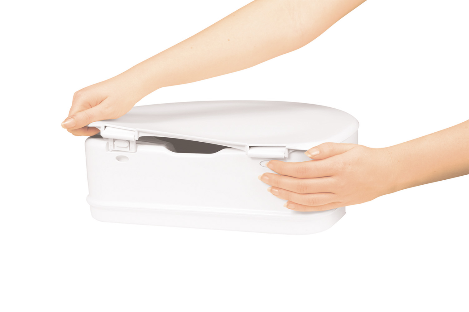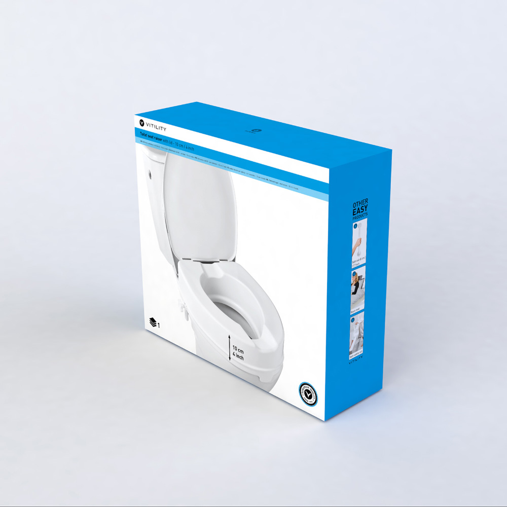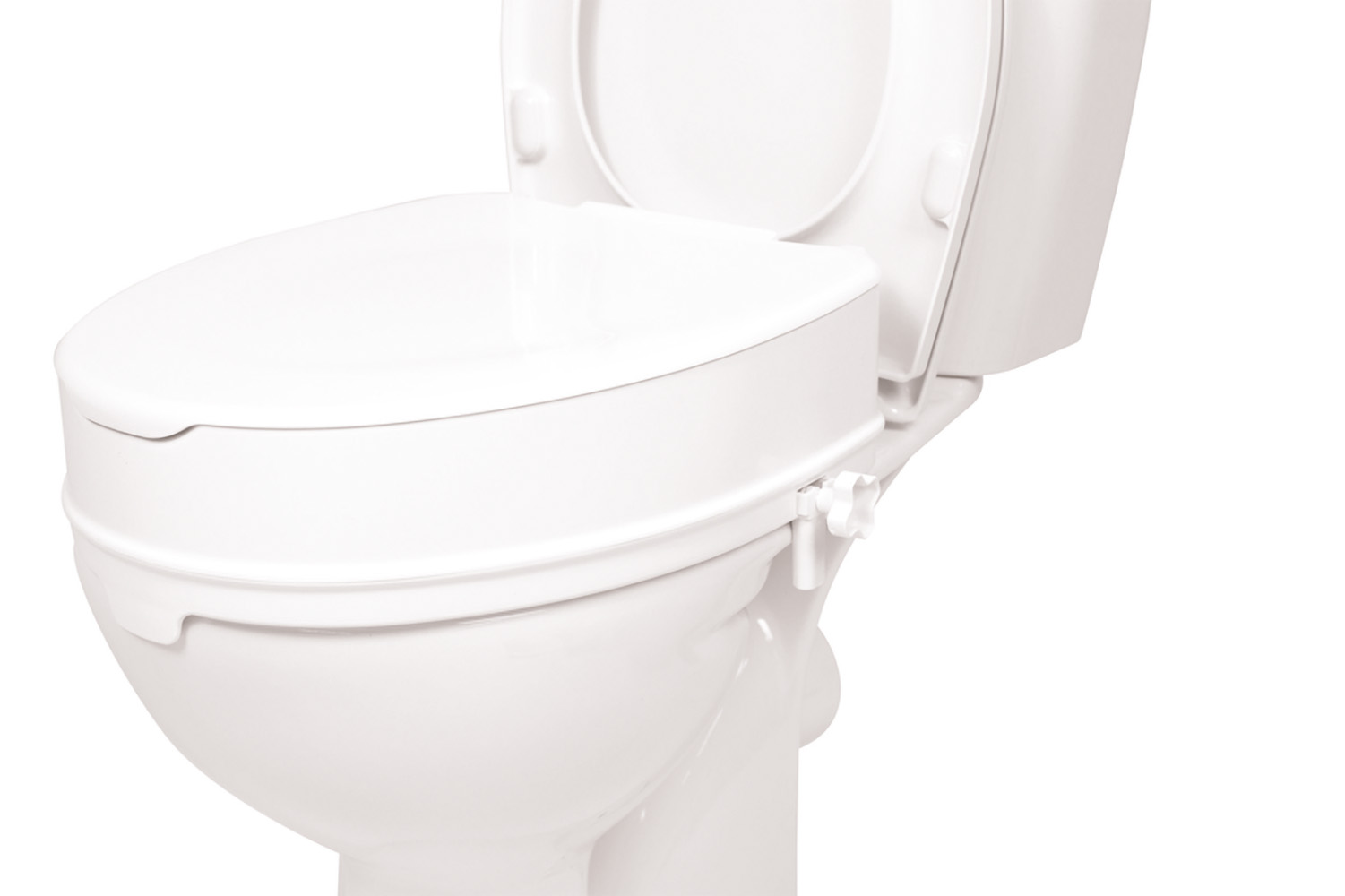 The toilet seat raiser with lid can be installed simply and securely on almost any toilet, and removed again. The toilet seat raiser increases the height of the toilet, making sitting down and standing up again easier. The seat raiser is easy to clean. The lid is also easy to remove if necessary. The openings this leaves in the seat raiser can be covered using caps delivered with the product.